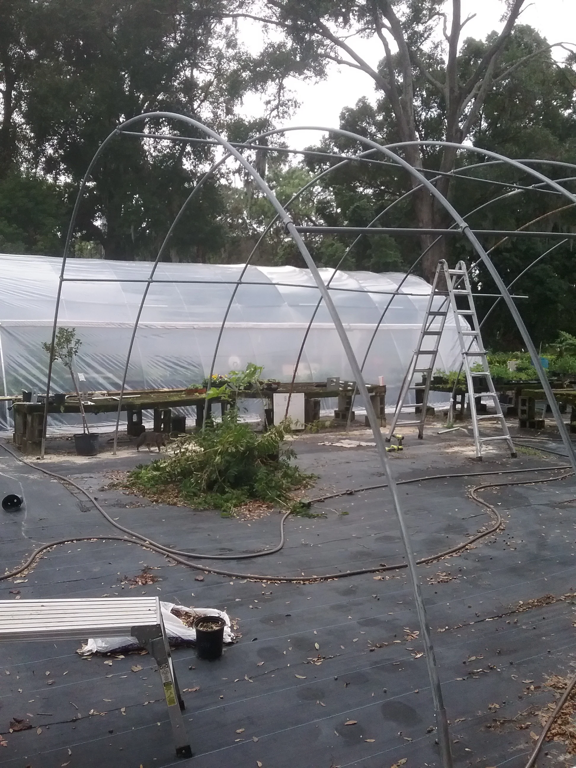11.8.16 Started construction of our 3rd greenhouse at the nursery, this one will measure 27' x 52'. We have had extensive damage to our infrastructure at the nursery due to the last few big storms that passed through. Our main greenhouse was repaired just a few days after the storm. this new greenhouse will be dedicated to growing only edibles and will be close to driveway for easy loading tandem unloading. feeling excited to near completion, hopefully in the next 10 days.